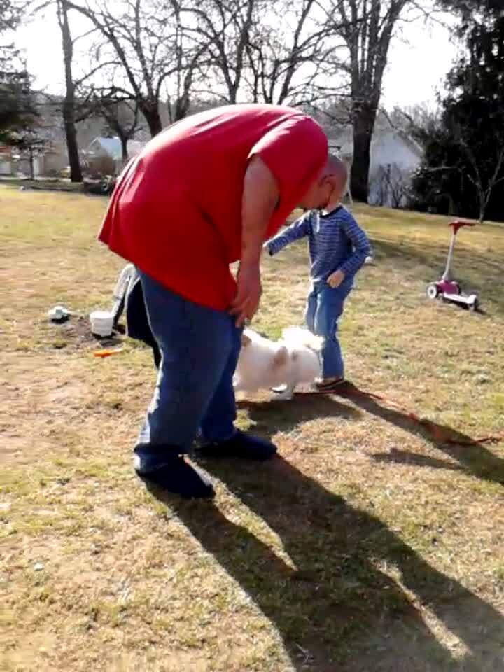 A shirtless boy runs to jump on his dad's back, when he moves and the boy goes crashing to the ground.