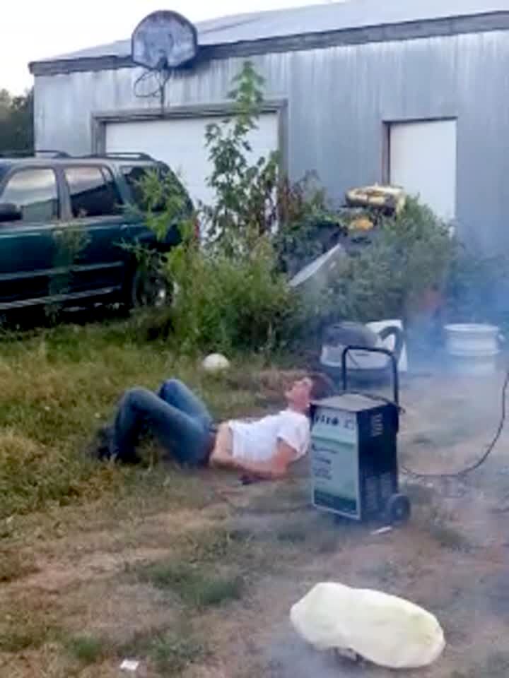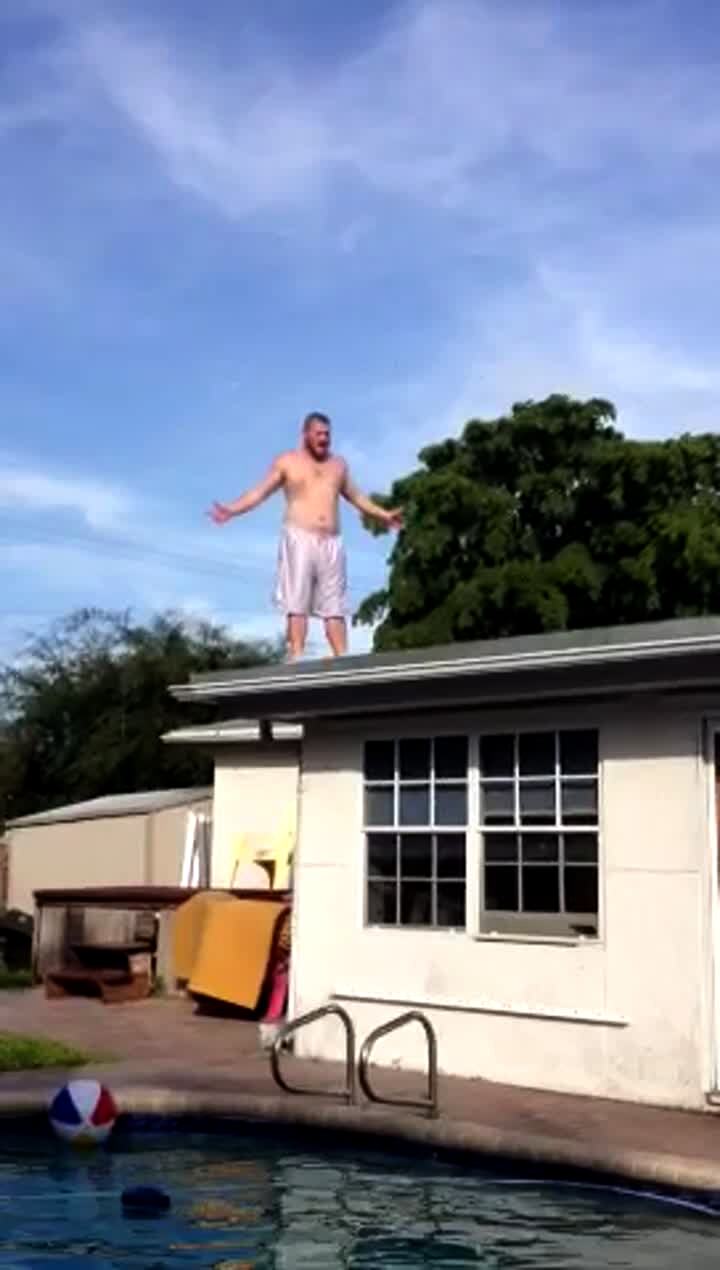 A man attempts to jump off a roof and into a pool. At 0:18, he slips and falls in on his back. DON'T USE THIS CLIP - DANGEROUS AND IMITATABLE
