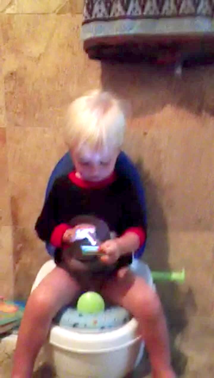 A tot boy sits on the toilet using his moms iPhone when he drops it in. Action at :18.