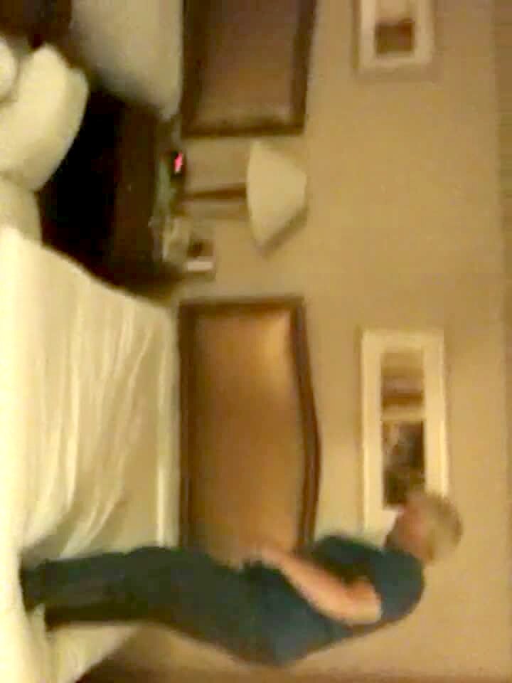 An old woman takes a while before trying to jump from one hotel bed to the other and then she falls. Senior