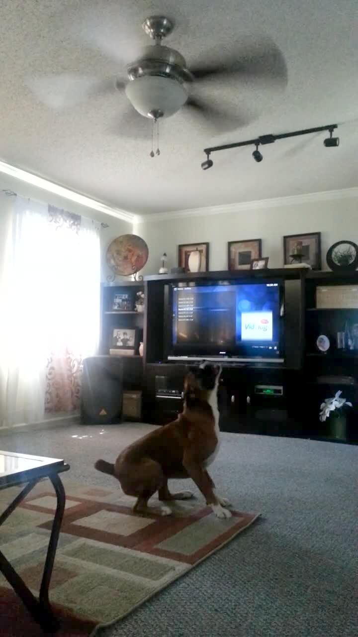 A dog barks at a ceiling fan, jumps up, and turns the light on.