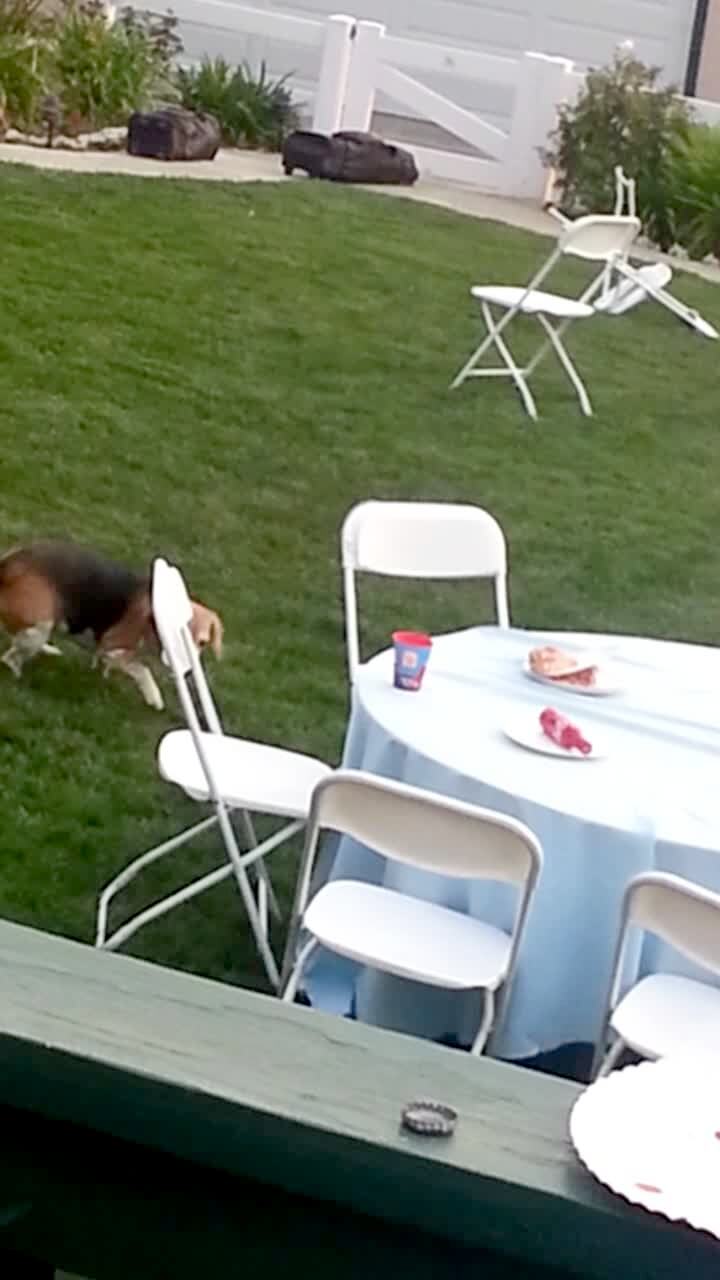 A beagle is pulling tablecloth on outside table to bring pizza closer. She ends up nabbing a slice.