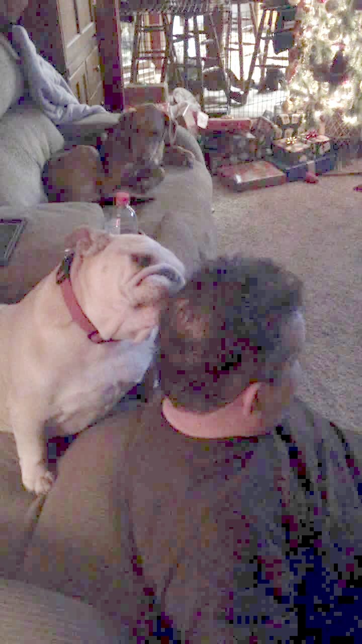 A bulldog dog licks the back of a man's head at home and then spits up.