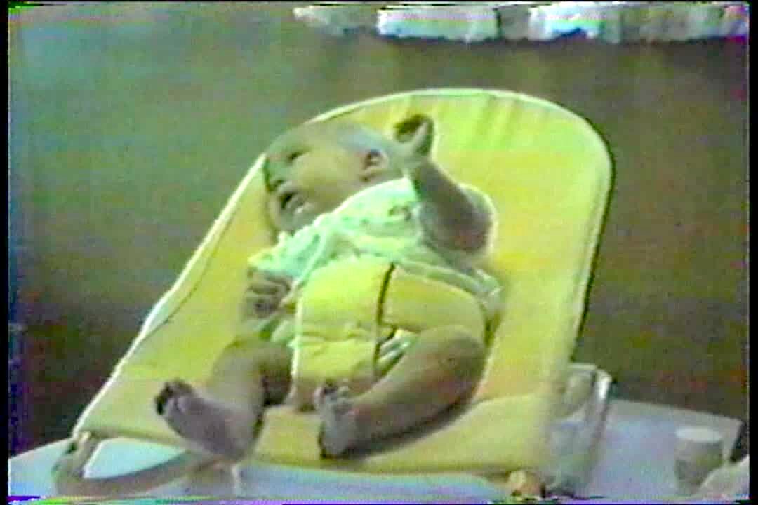 Baby boy plays with Grandpa's face while he's held in the kitchen & laughs. Senior man says "don't throw up on me" then baby spits up on him. Gross, puke, vomit. Short tails.