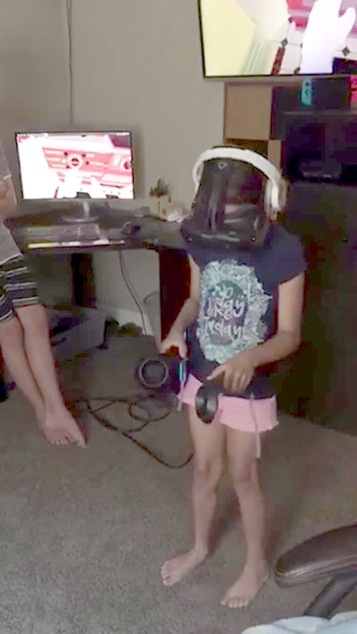 A young girl falls down while she plays a virtual reality game and hits her head on a couch.