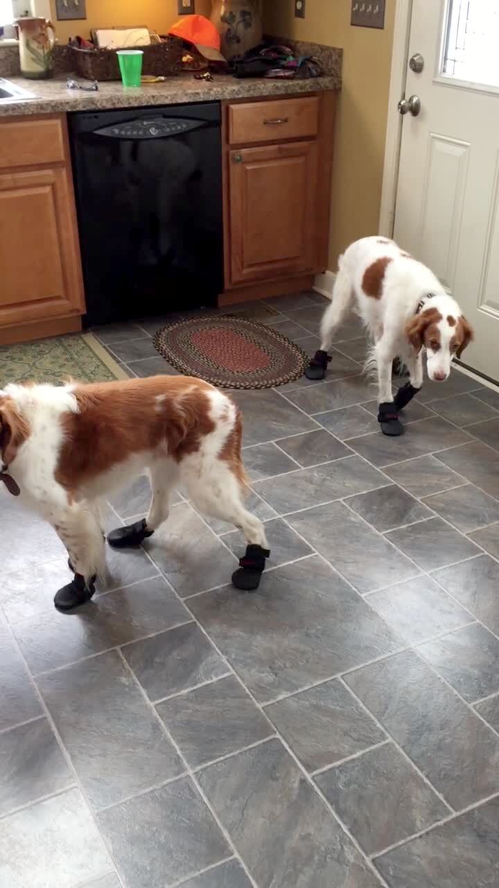 Small white dog walks funny outside with pink slippers / booties on his feet / paws. Silly pet tricks.