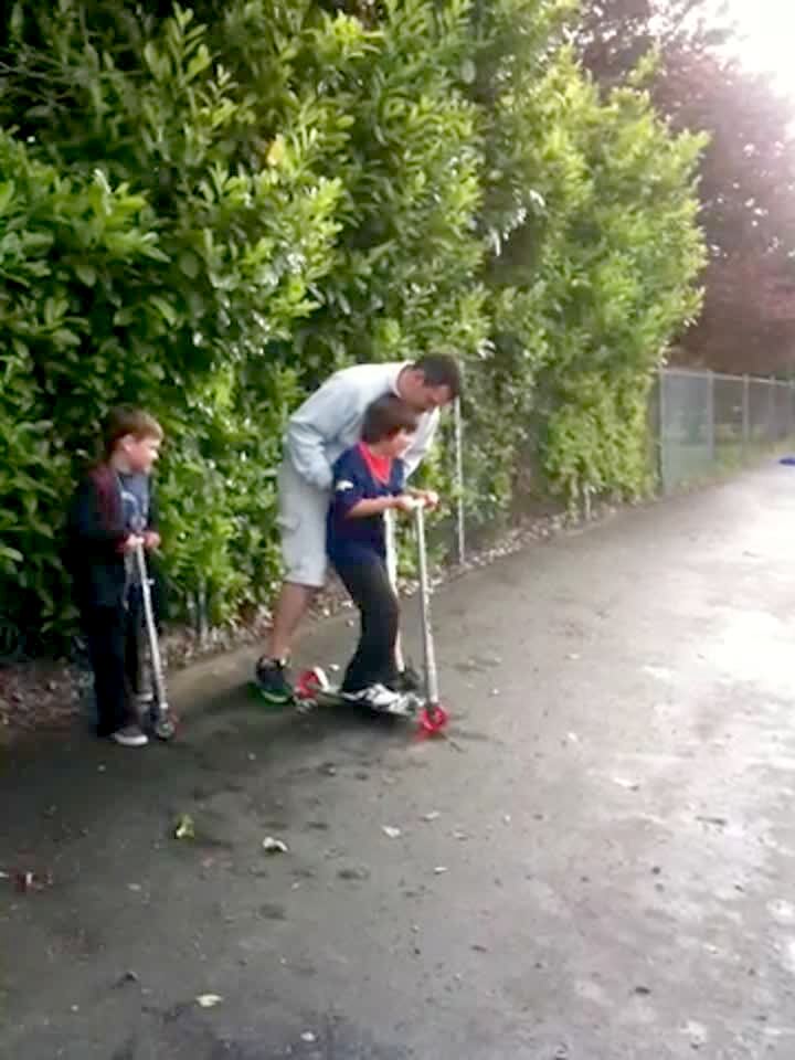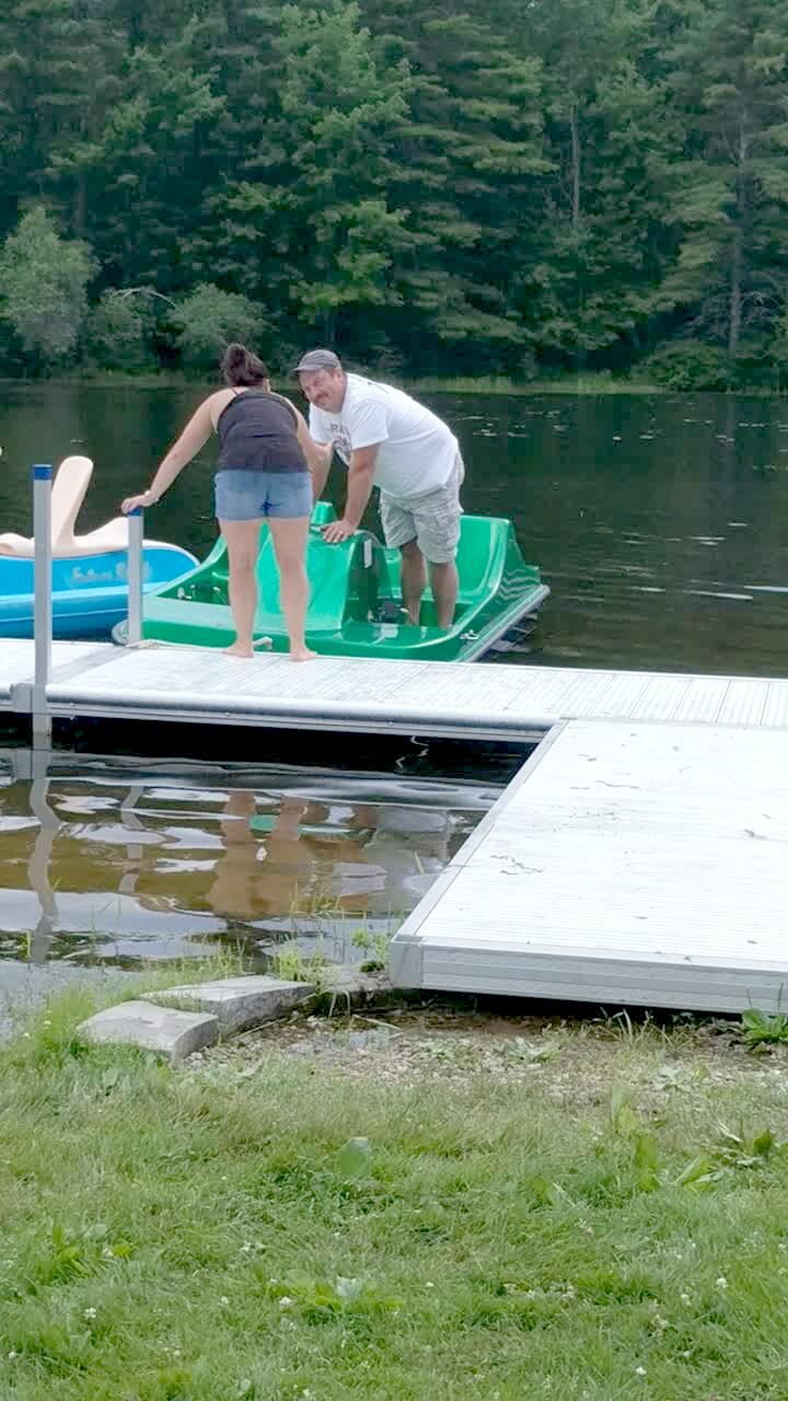 Mom rides a mini bike down a pier at the lake and can't stop at the end of the dock, she falls into the water with the bicycle. Bonehead. Possible set up.