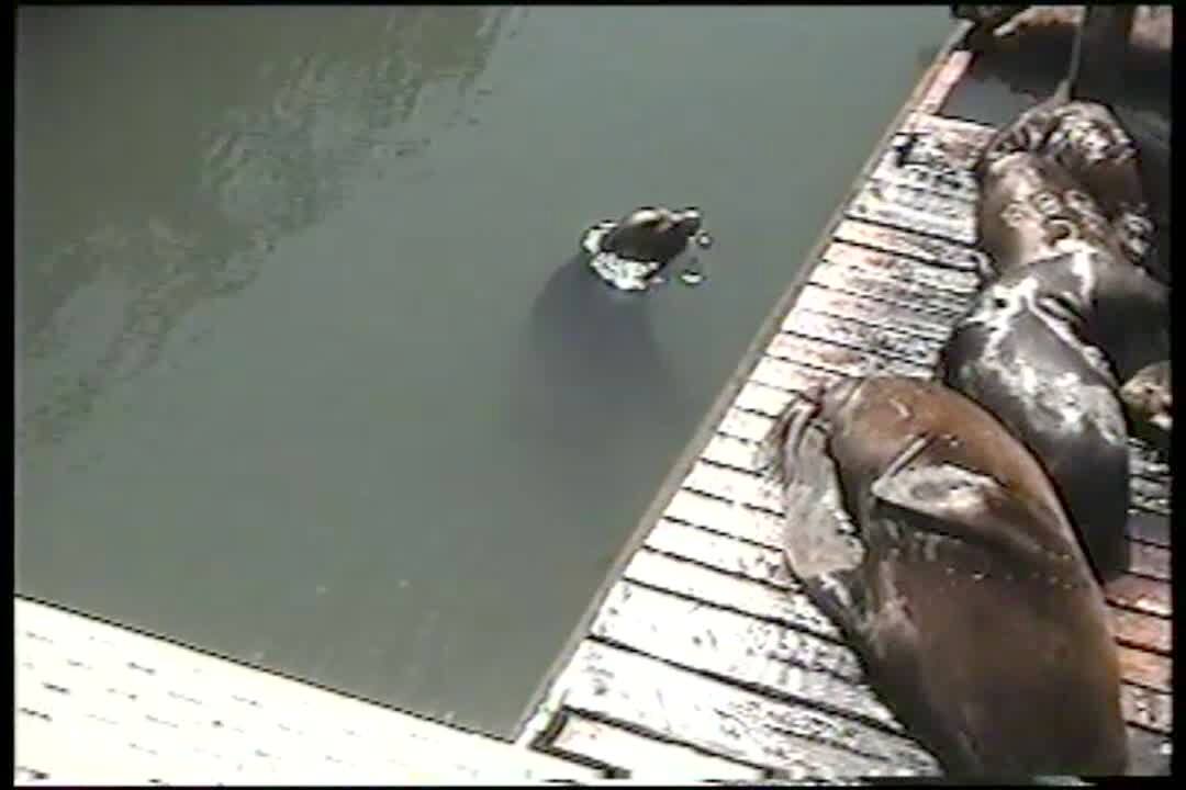 "Dock Dumper" sea lion in the water tries to get onto dock, tips it over & makes all the sea lions laying there fall into the water. seals.