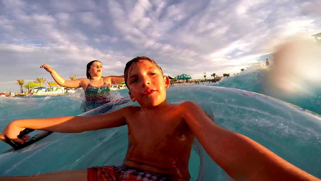A young boy on a tube in a wave pool at a water park repeatedly says "And now, Tom Bergeron!" Introductions. Good take at :38.