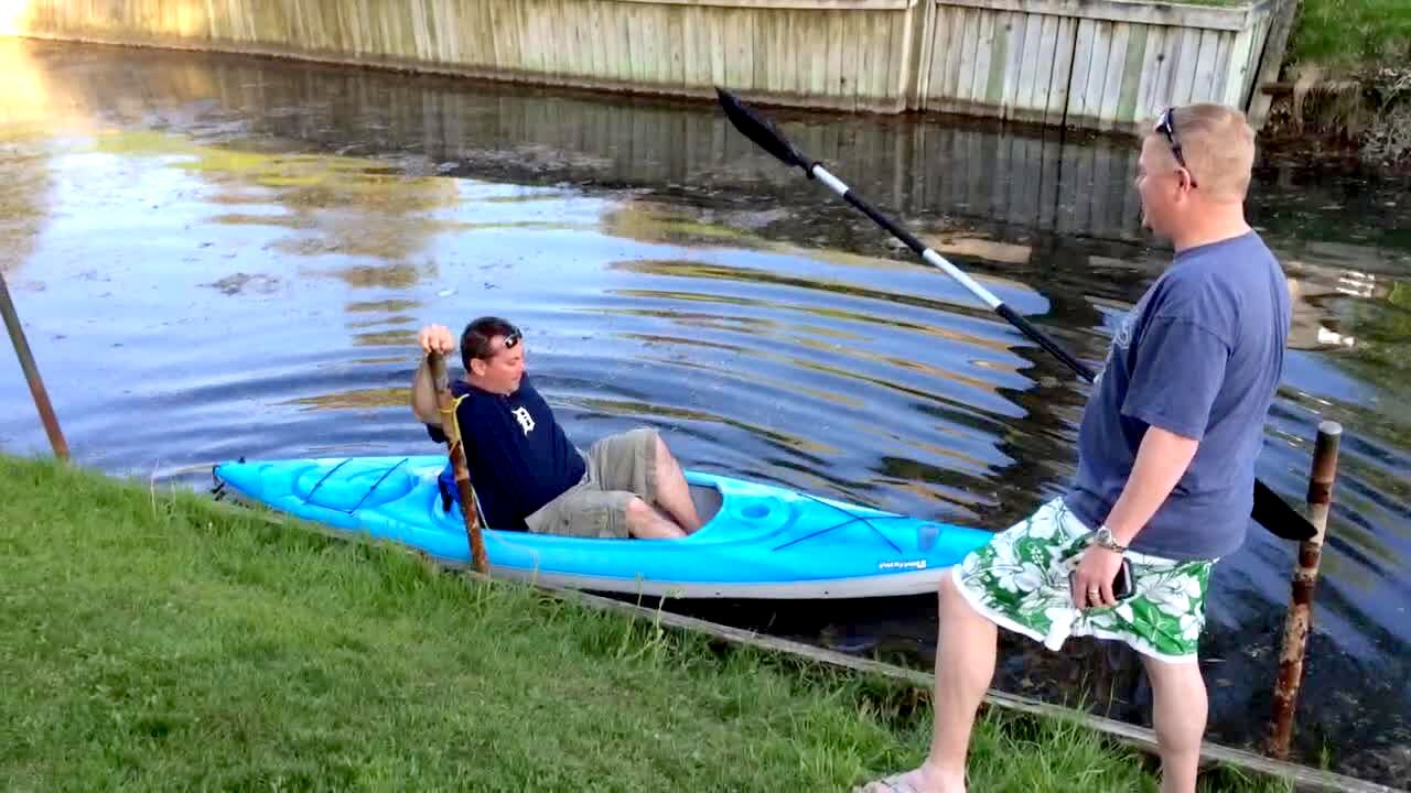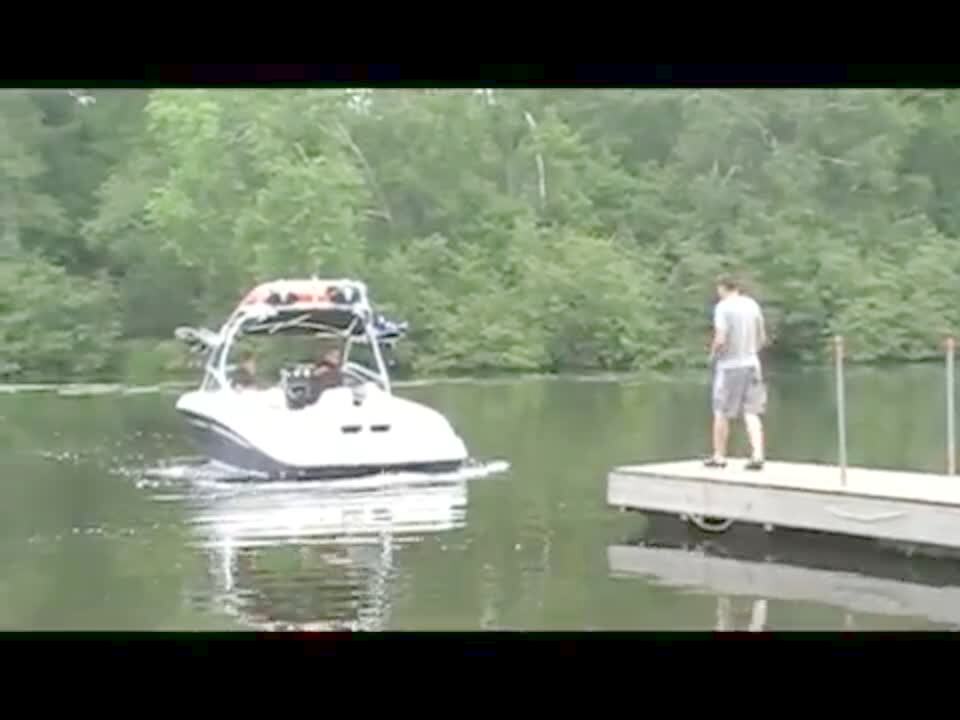 Man pushes zip lines across a small lake. He knocks a man out of his boat & into the water when he tries to ride zip line into the boat.