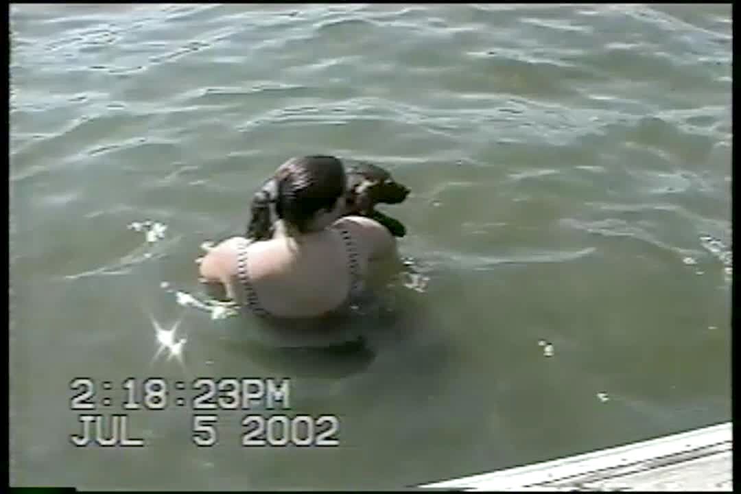 A fish jumps out of the water and hits a woman in the face while she holds a puppy. dog