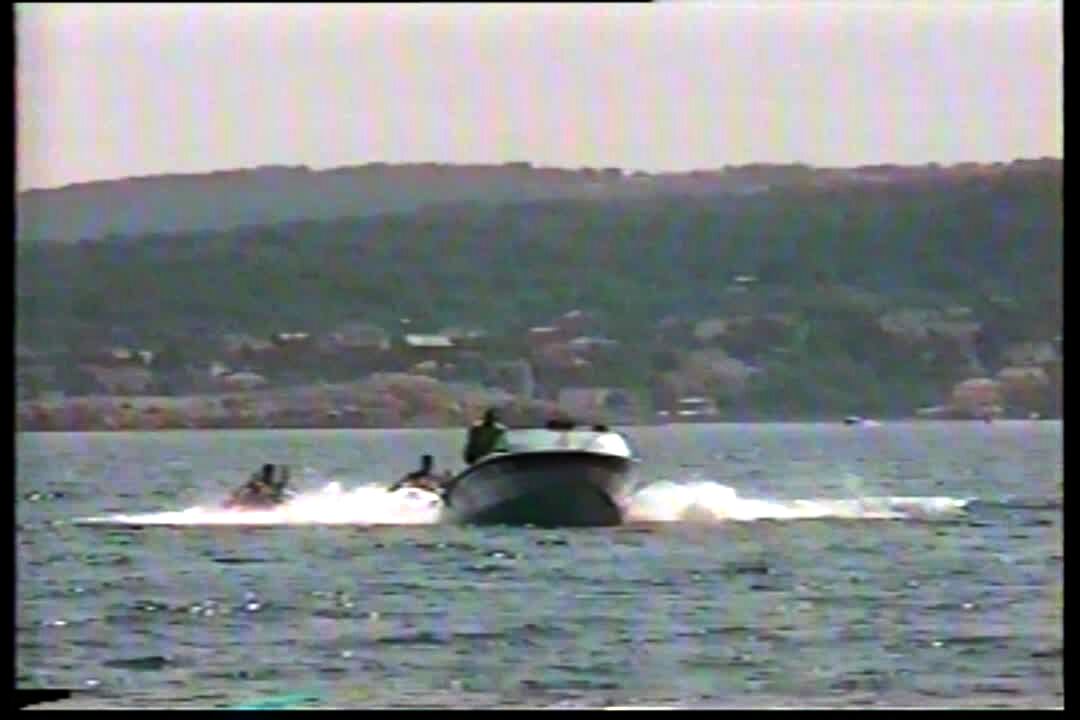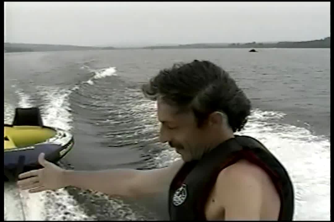 A man jumps from a moving boat to a tube behind him. He misses the tube and lands on rope on groin.