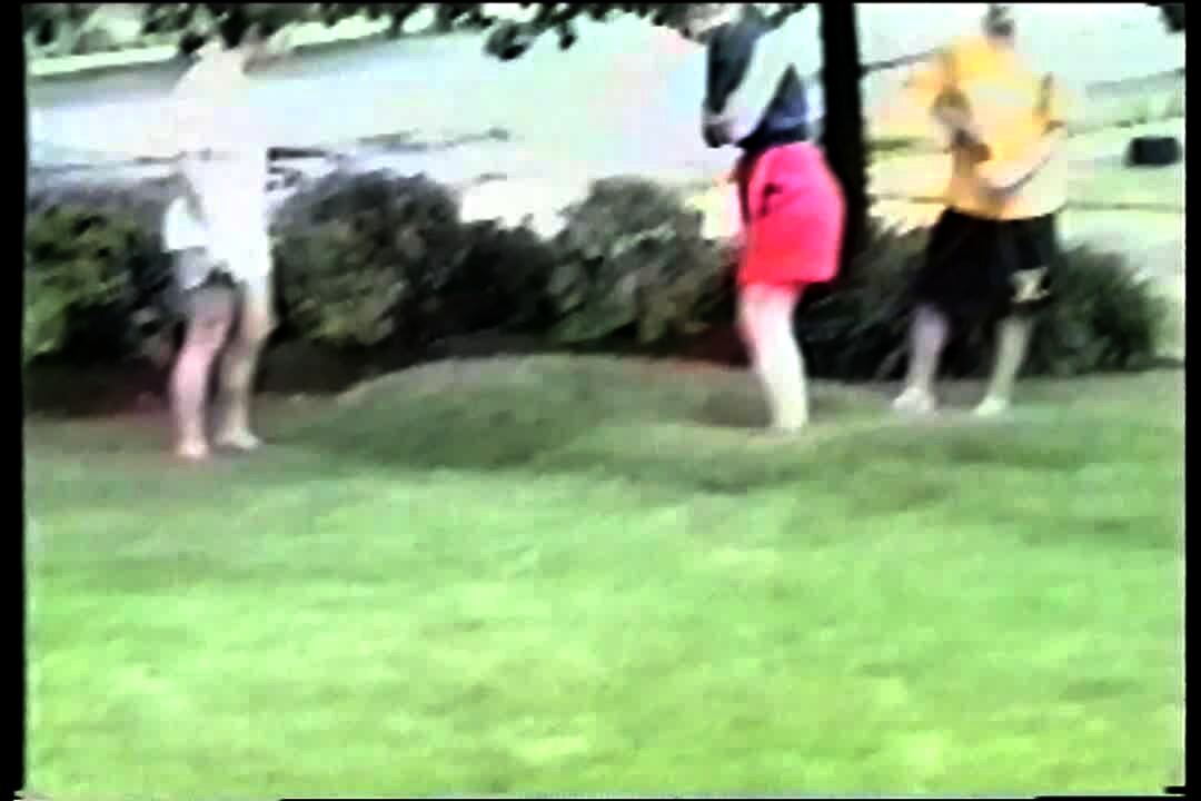 Fishing tot boy casts line, accidentally hooks dad's crotch. Groin hit. Lake, summer.