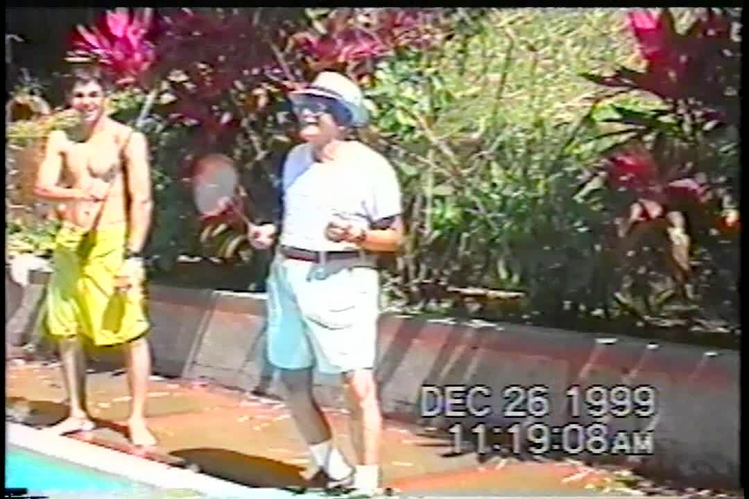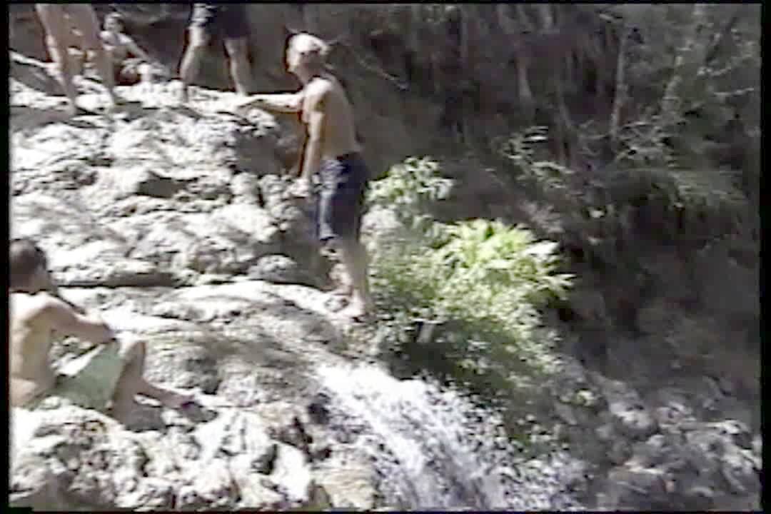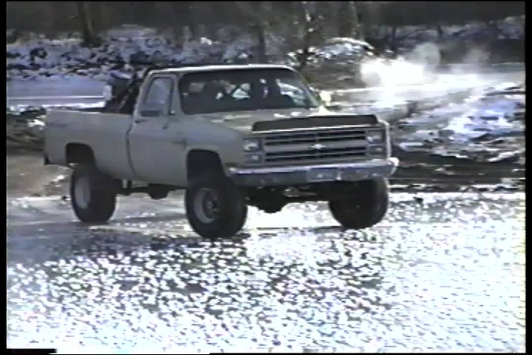 Fire department initiation. Rookie fireman holds onto back of truck for a ride, truck starts forward and a bunch of water dumps on his head.