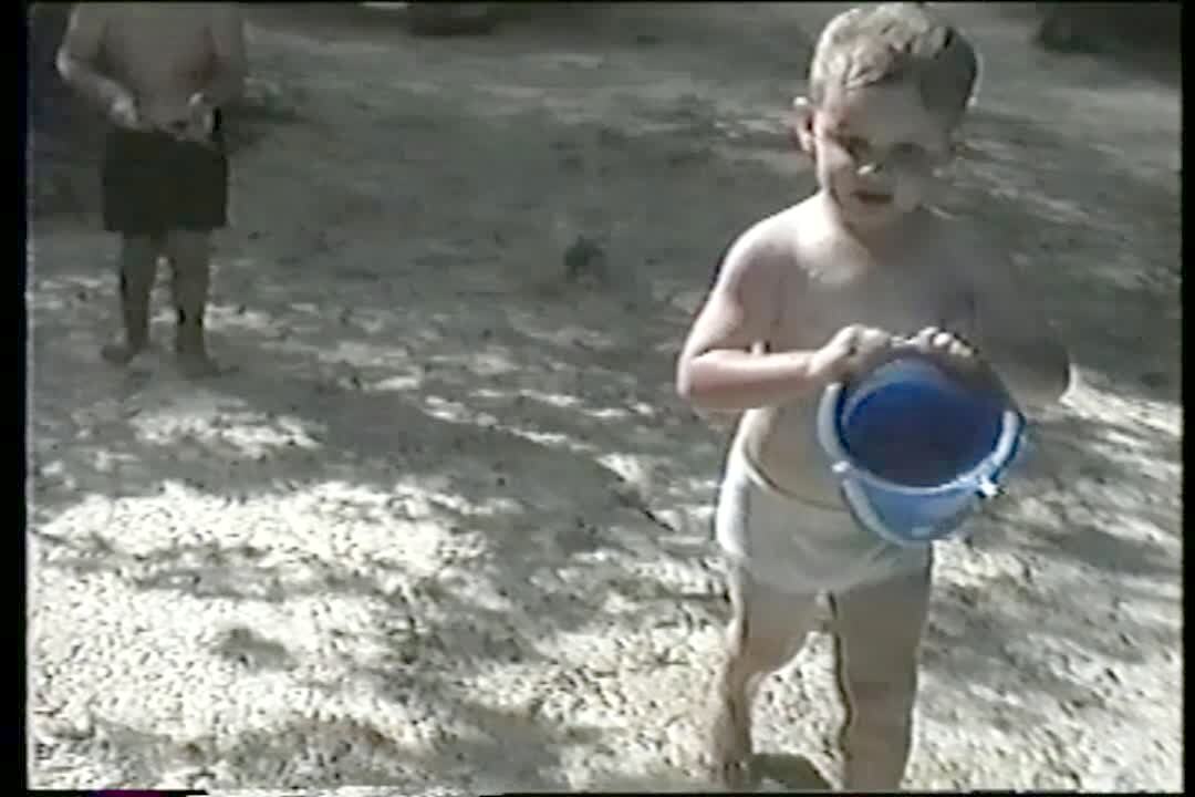 Tot boy in underwear chases camera woman around outside with a bucket of water as woman says "Get your Grandma! Not me!" Senior woman