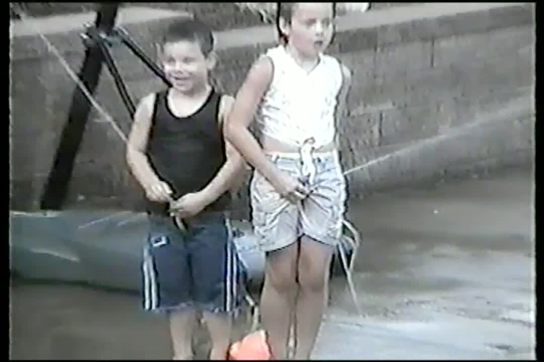 During rain storm, water builds up under patch of grass making the grass appear to be a giant water bed. Kids jump on it.