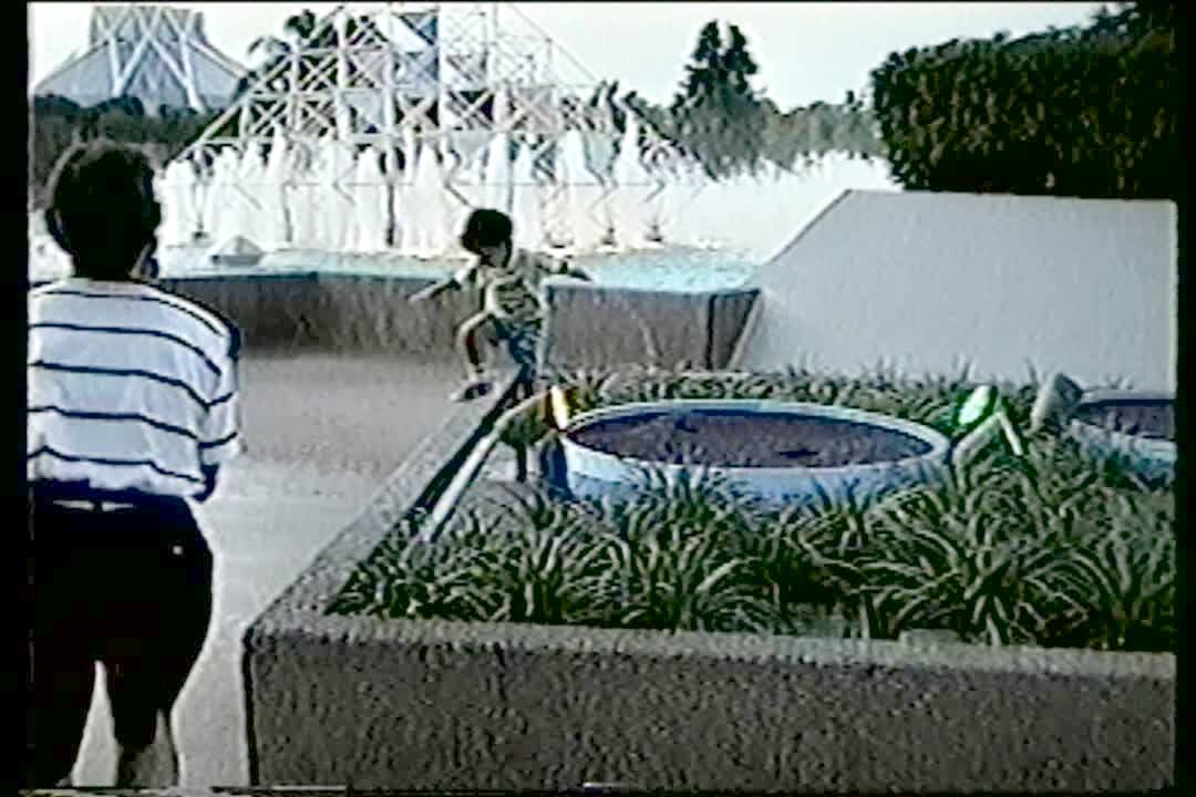 Kid gets hit in the face with dancing water fountain at Disney park. Shooting