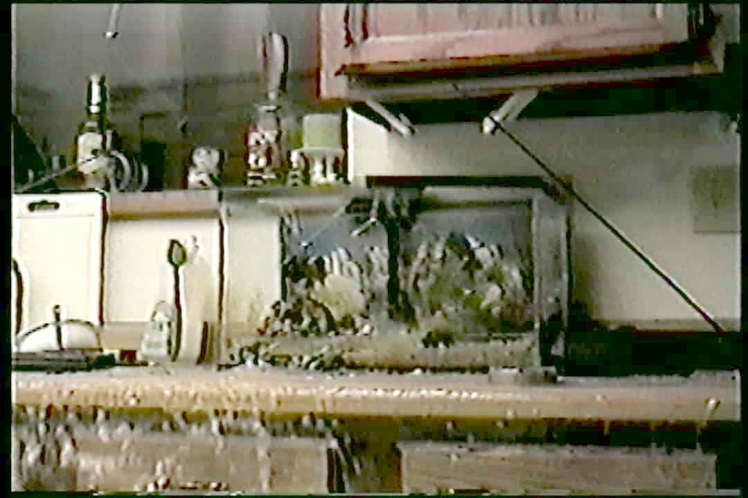 As a joke, people fish in their home fish tank. After, person tries to pick tank up and it breaks, woman screams, and water goes all over.