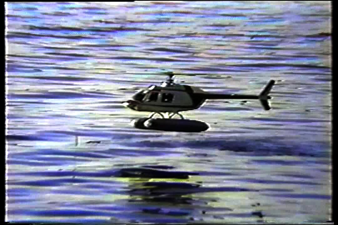 Toy remote control helicopter crashes and sinks when trying to land on lake.