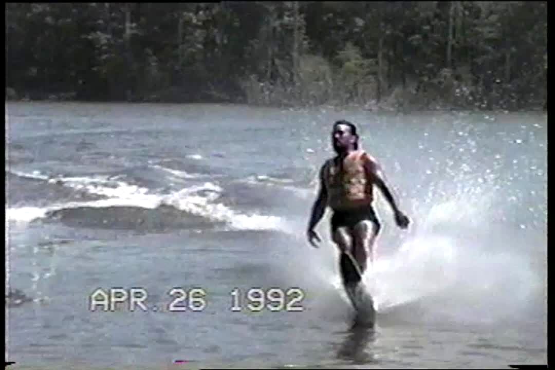 A man gets on rope swing, breaks tree trying to swing into lake. Man and tree fall into water.