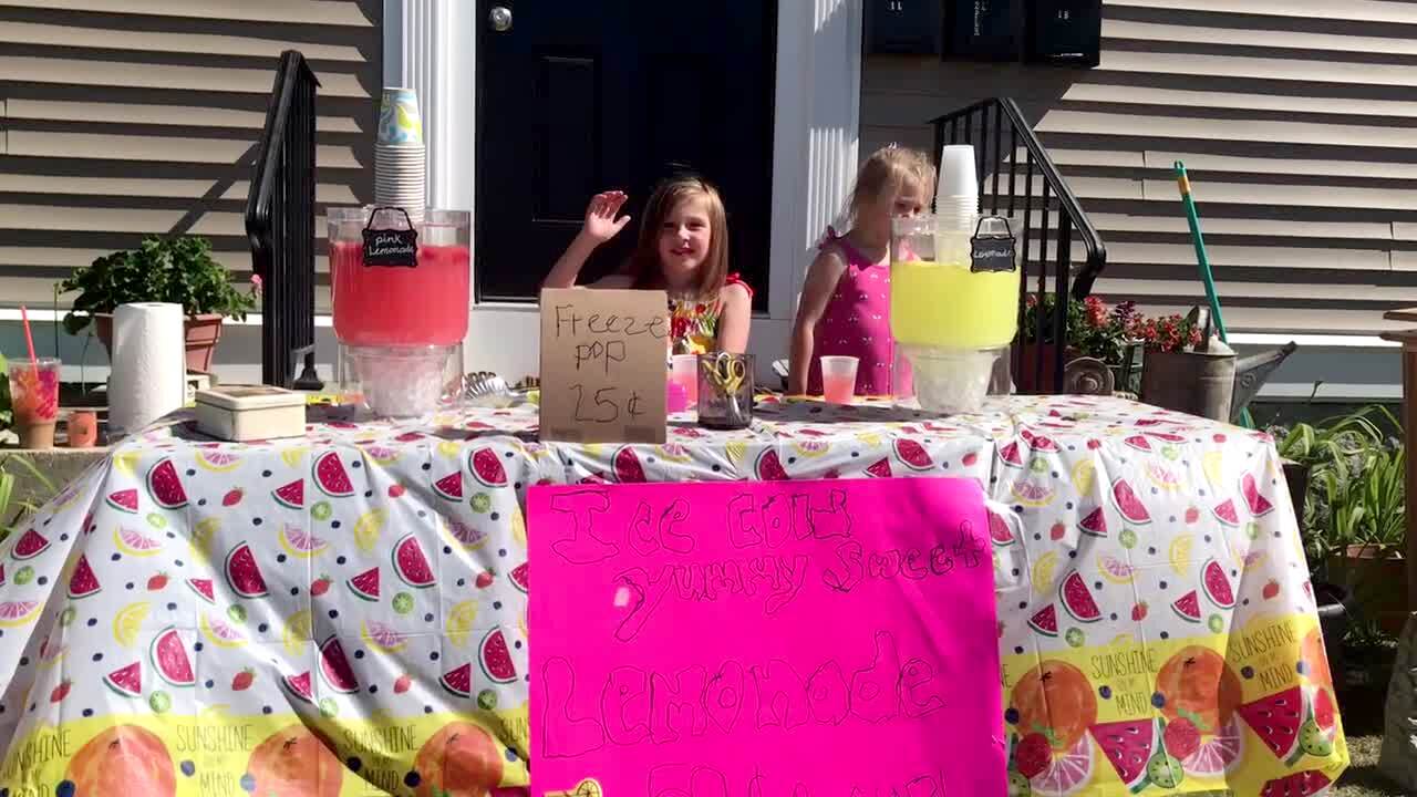 A young girl and her little sister sing a song about lemonade at their first lemonade stand and then the table collapses and the older girl says, "I knew that would happen," and the younger girl cries.