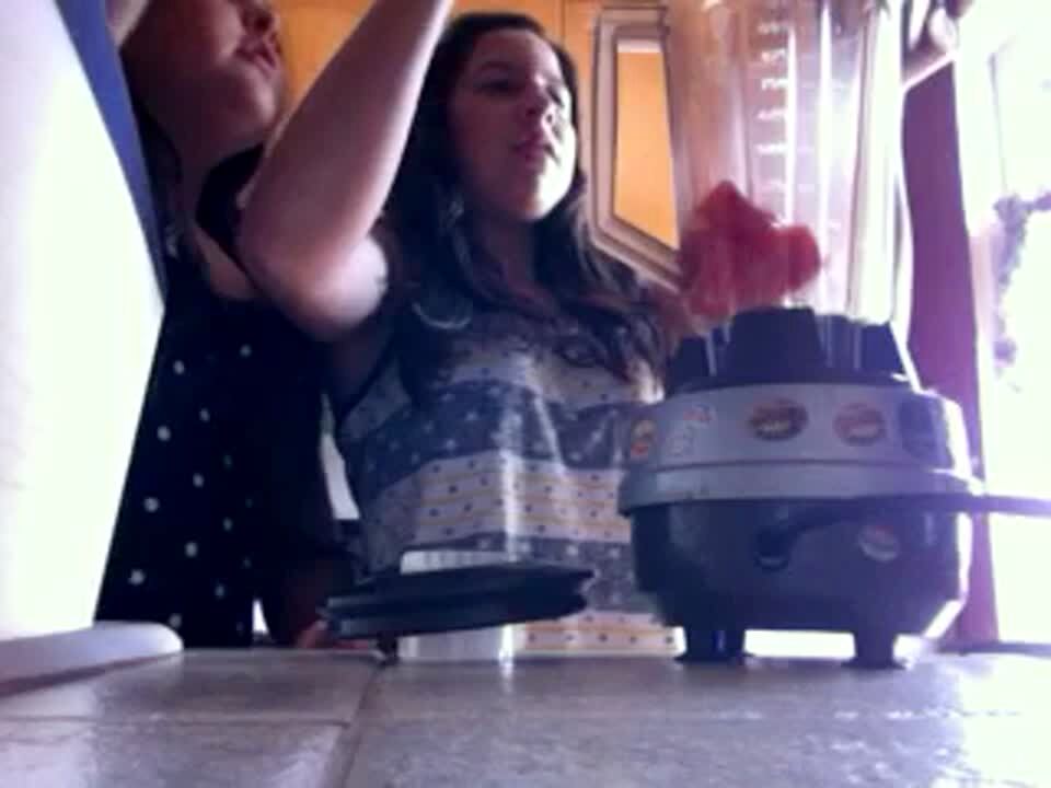 Two girls talk to the camera but how to make watermelon juice with kitchen appliances and watermelon. After they put the watermelon into a blender, one of the girls slips and falls. At 1:40 they turn the blender on and it blends briefly before it breaks at the bottom of the blender and watermelon juice sprays on them and everything in the kitchen.