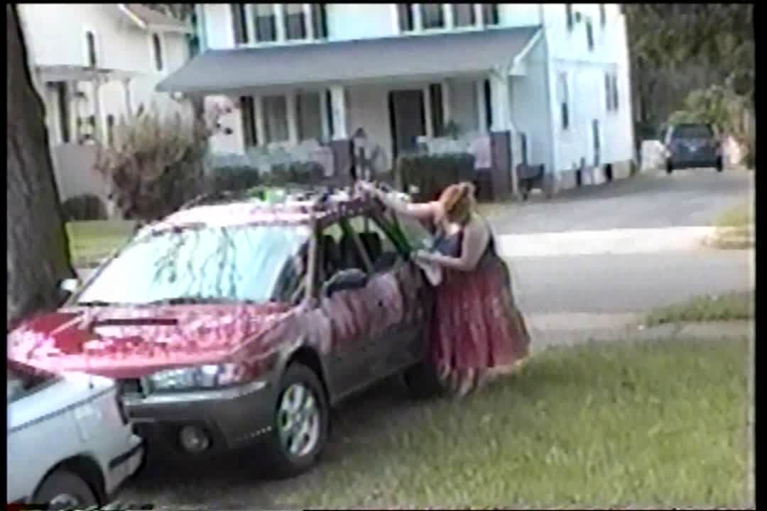 Teen girl waxing car. Her arm gets tired so she starts to wax the car with her thigh. The camera catches her.