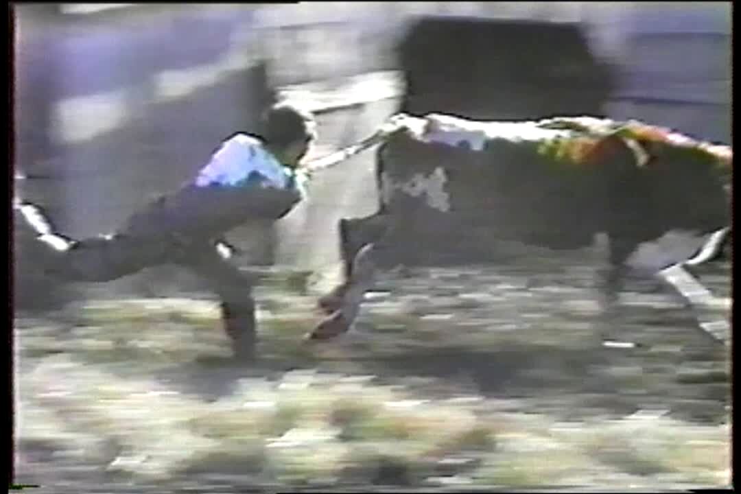 Men go cow skiing - pulled by tail of running cow across mud.