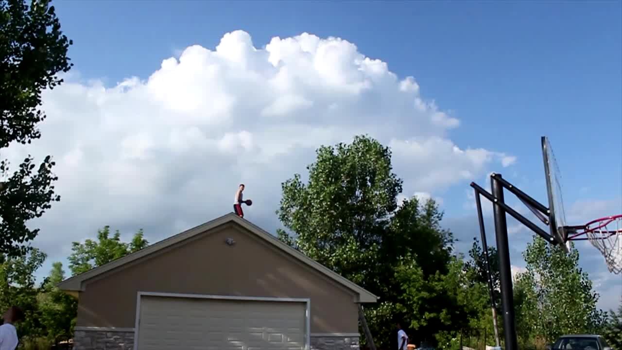 A boy kicks and bounces a basketball against his garage door to score a trick shot but it misses the basket and hits his friend in the face. AA: Basketball Trick shots