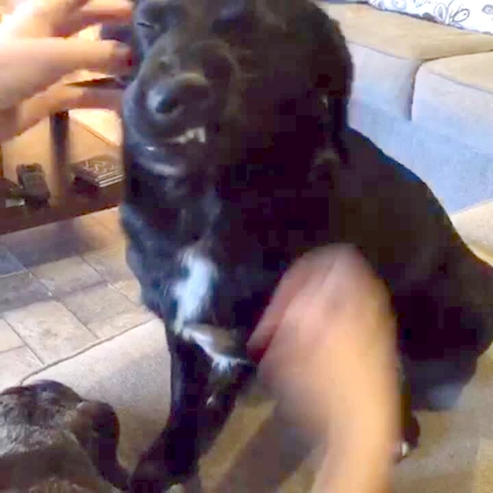 A dog wiggles his snout and snarls every time one of his ears gets scratched indoors.