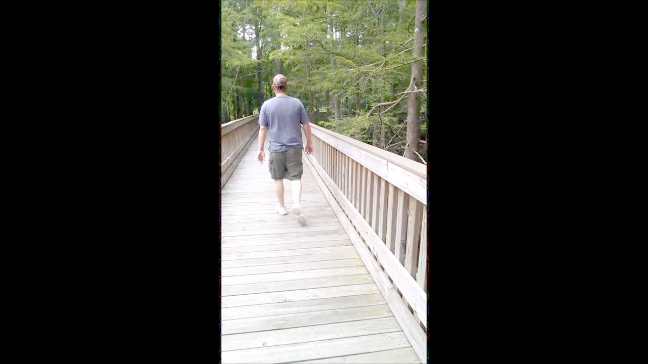 A man walks through a spiderweb on a bridge outdoors, flails around/ does a funny dance, then keeps walking.