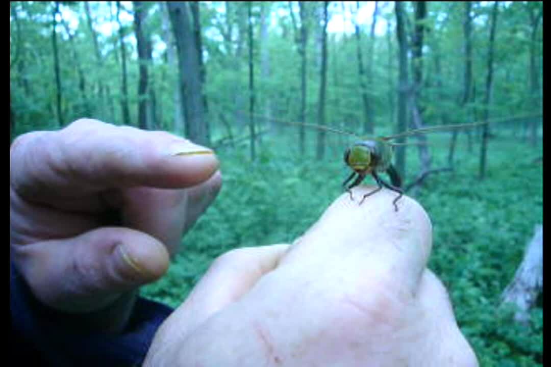 Man has a dragonfly on his hand in the woods, the bug gives the man's finger high fives. Insect.