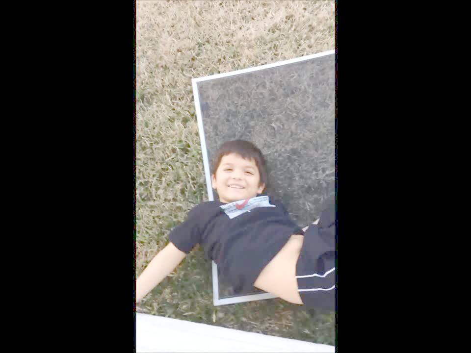A little boy sits on a window sill and opens the window, only to push out the screen and fall out the window onto the grass.