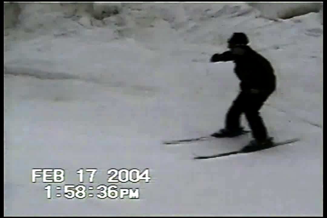 Snow Fall. Man on flying saucer flips over while going down snow bank. (inner tube)