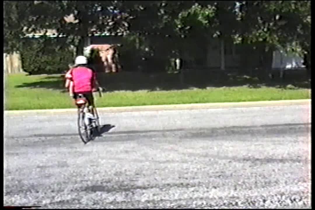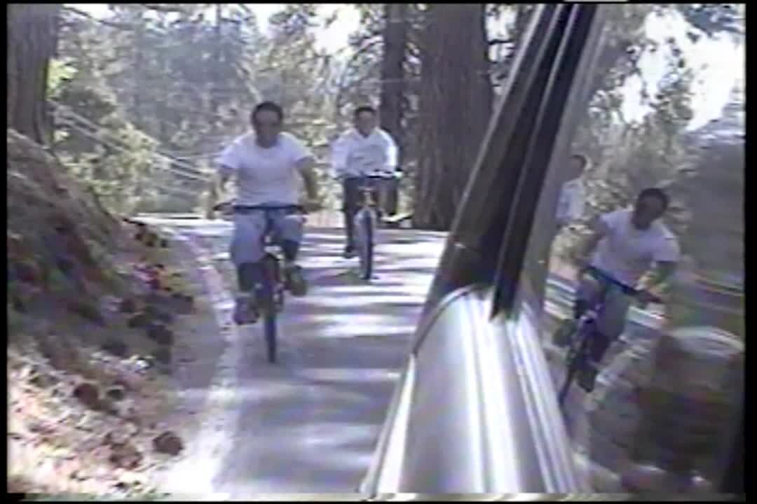 Teen boys try to tow a friend on rollerblades down street behind car, tow rope snaps and teen boy falls down. Rollerskates. Boneheads.