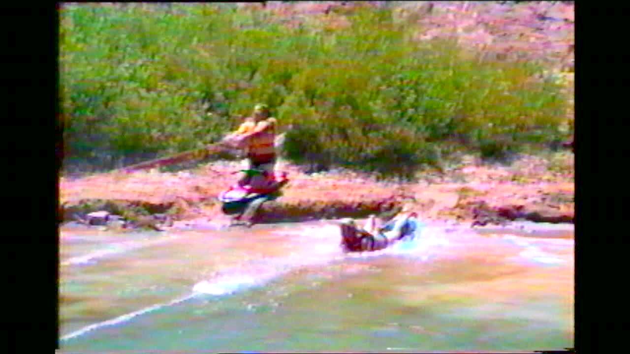 Water skiing: 2 teens on knee boards wipe out on take off.