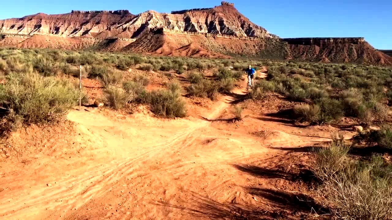 A teen boy rides a bike down a desert trail and goes off a jump. He lands and then crashes into his dad at the end of the trail.