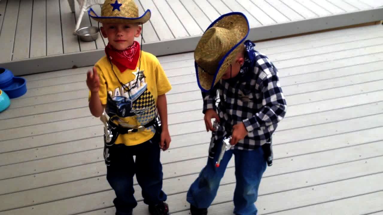 Twin little boys play with toy guns outdoors as the man behind the camera gives them direction. The boys freeze when they don't understand the word 'draw.' They do a drawing motion with their hands as if drawing a picture