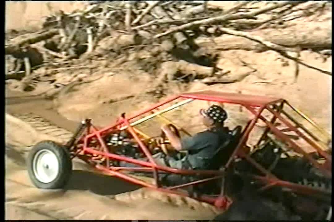 Man in dune buggy tries to go up steep sand hill. He gets to the top of the hill and flips backwards back down it. He is ok.