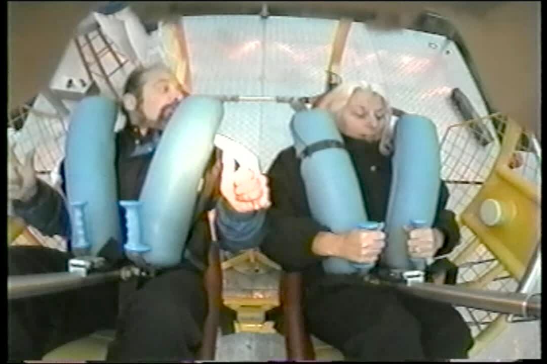 Bungee ride, ejector seat ride - man screams the whole time on the ride. Slingshot.