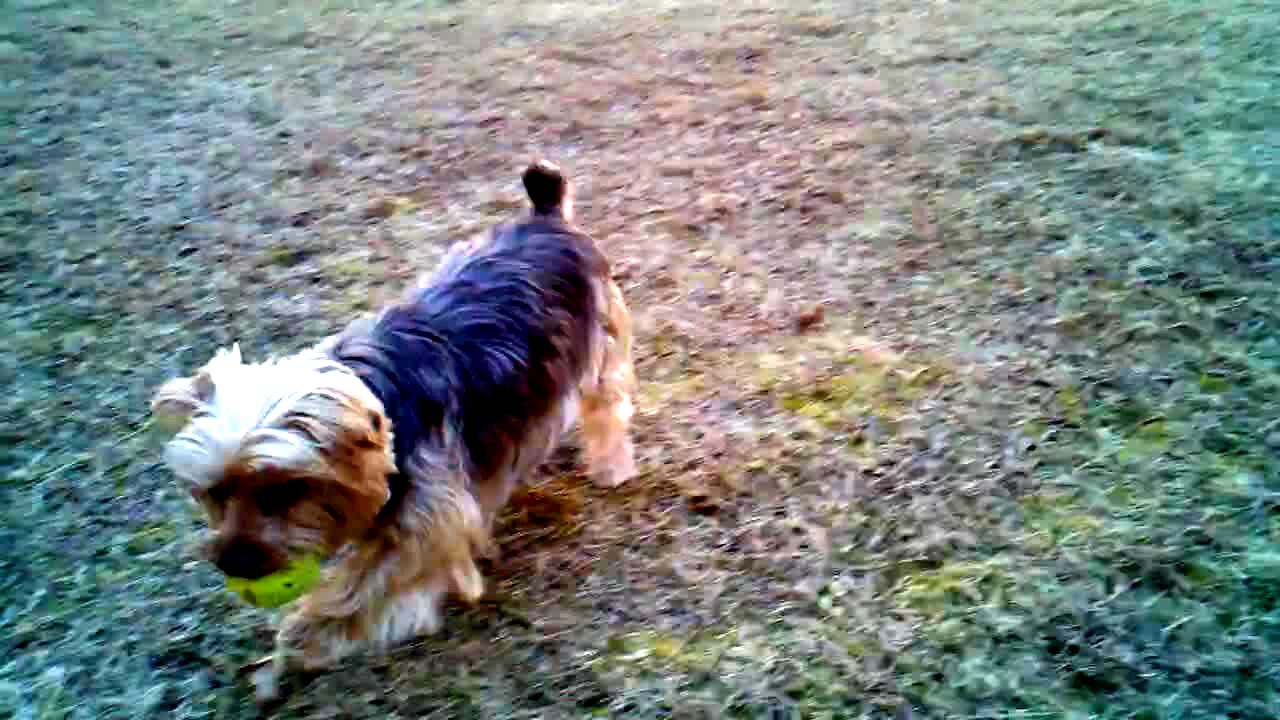 One Yorkie dog keeps tennis ball away from other in backyard as they both turn in circles.