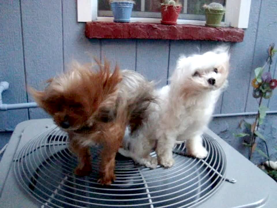 Small dogs stand on top of the air conditioner and their hair / fur blows up.