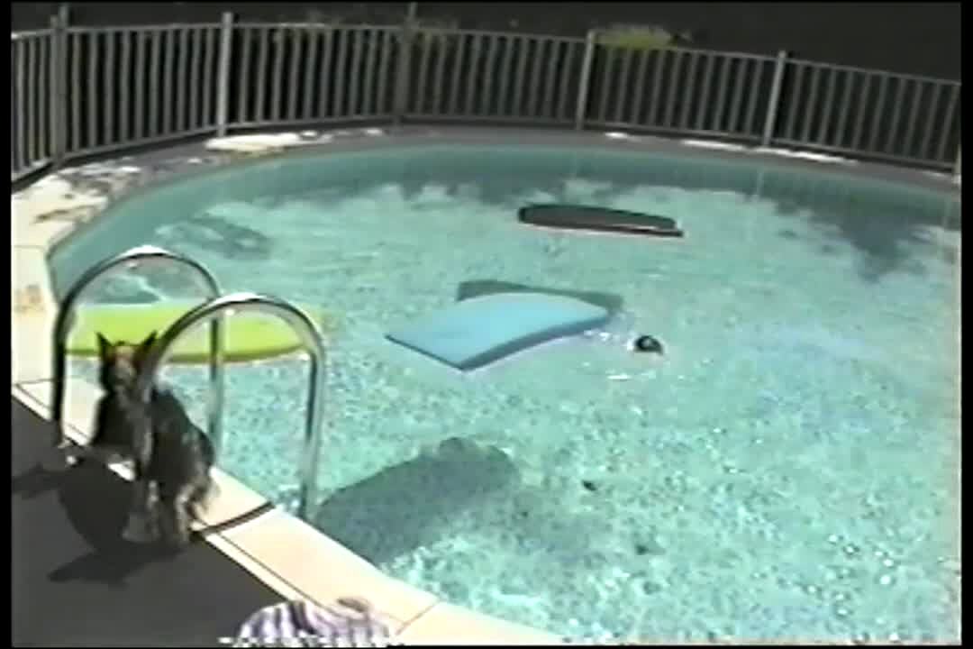 Dog, Yorkie, walks across 2 boogie boards in a pool. Grabs a floating ball and swims to the other side of the pool.