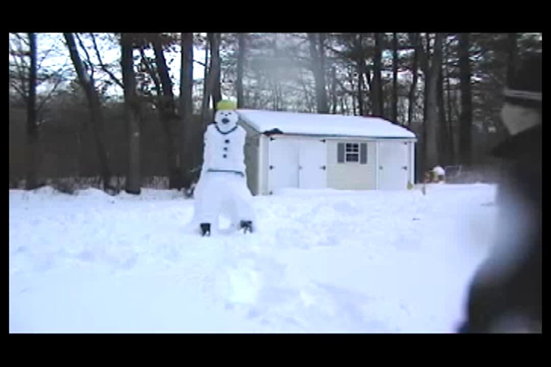 Man rides backyard zipline and crashes into a 6ft. high standing snowman, destroying it. Winter.
