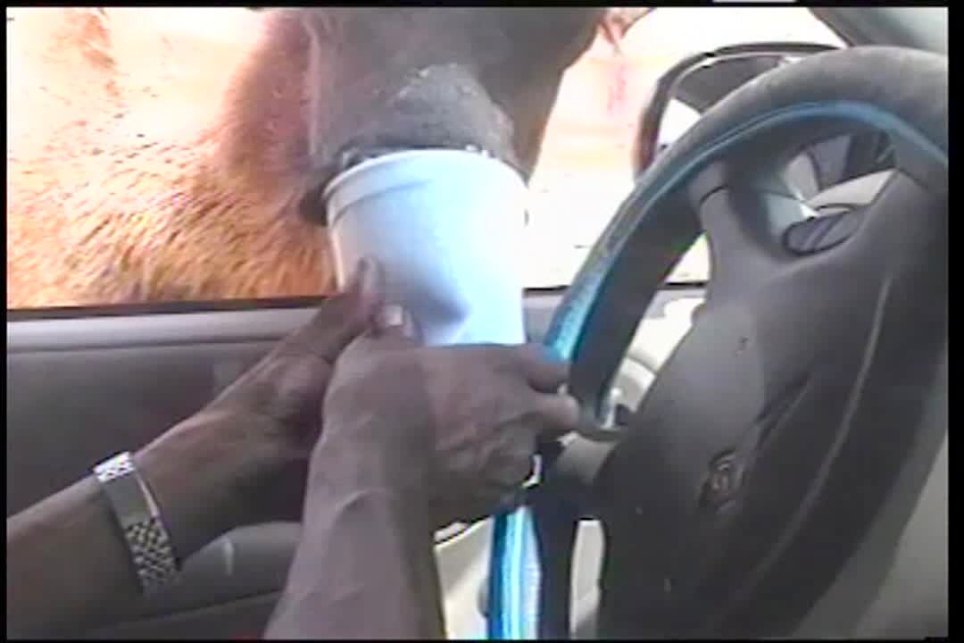 Drive through zoo. Big elk peeks his head into car window & eats from man's cup. takes the entire cup of food, eats it all. Safari. Vacation