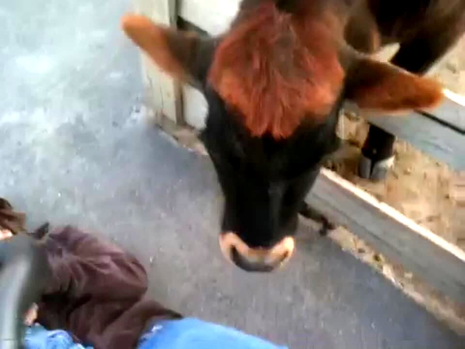 At a petting zoo, a cow uses its head to knock over a girl holding a baby.