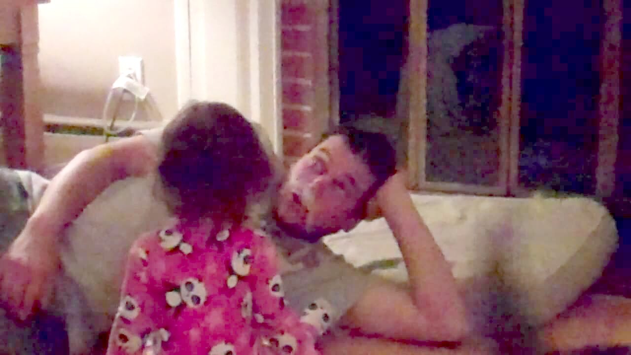 A man uses dog fur to make a fake mustache on his face. He pretends to sneeze, blowing the fur off of his face, making his tot daughter laugh. He tries to do it again and accidentally sucks the dog fur into his mouth. The woman behind the camera laughs hard.