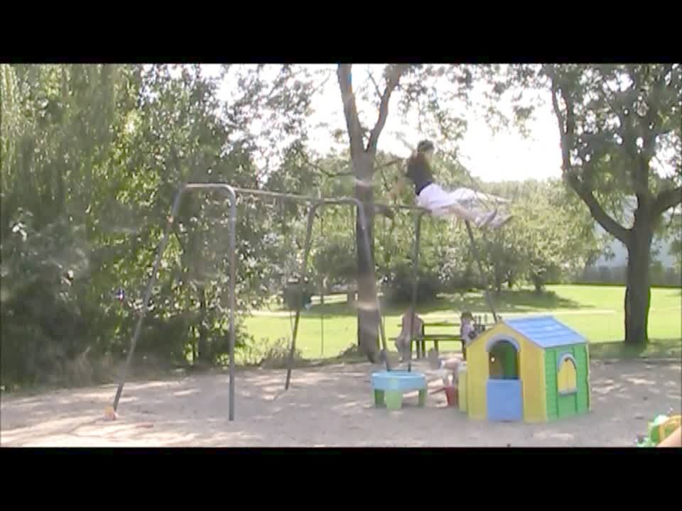 A teen boy swings on a playground swingset swing. He jumps onto a small toy plastic house, breaks the house, and falls hard on the ground. A young girl yells at him "You wrecked the house." Featured talent cleared (the boy who destroys the house).