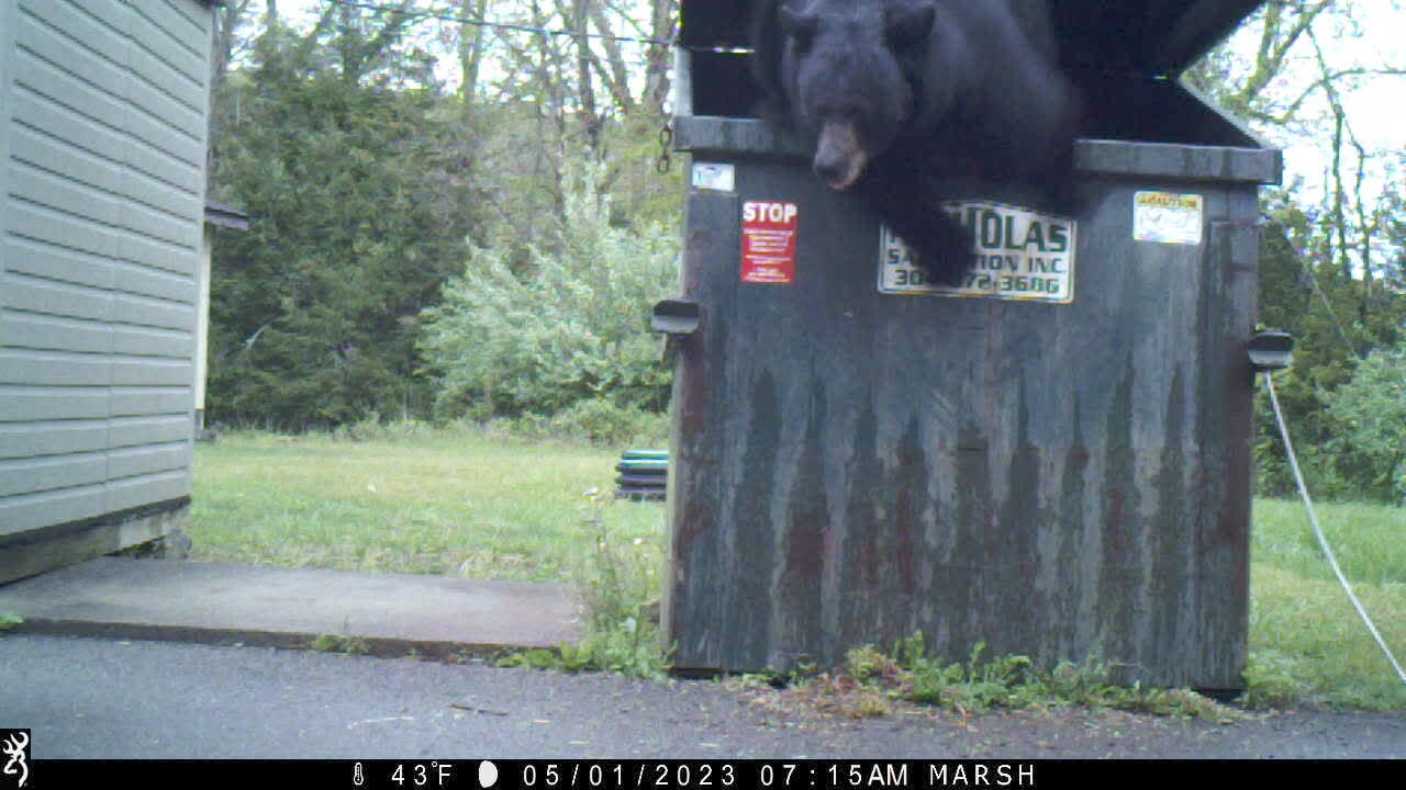 A man outside of a school unlocks a trash dumpster and a black bear crawls out. He runs away and then the bear runs in the opposite direction. Security Footage.