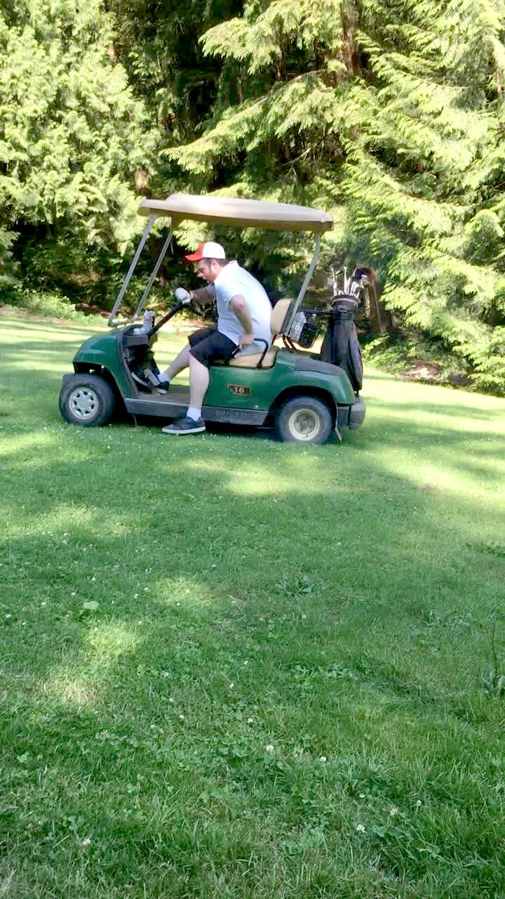A man loses control of a golf cart and rolls backwards down a hill at a golf course. Then he jumps out and the cart crashes into trees.